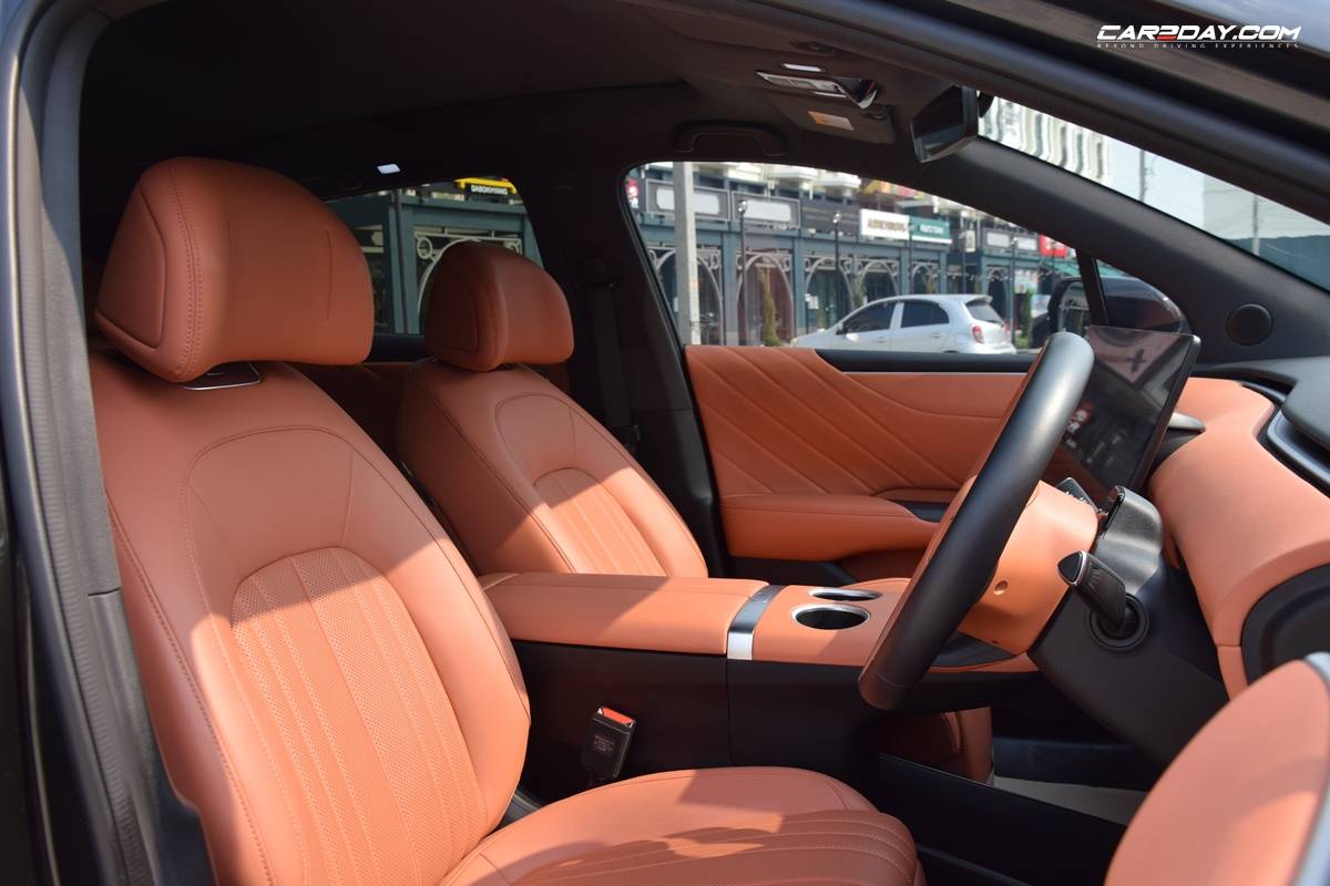 สบายแบบ 5 ที่นั่ง ด้วยวัสดุหุ้มหนังสังเคระห์สีส้ม เบาะนั่งคนขับปรับไฟฟ้า 8 ทิศทาง พร้อมปุ่มดันหลังปรับไฟฟ้า 4 ทิศทาง และที่รองขาปรับไฟฟ้า 2 ทิศทางมี ระบายอากาศ ตำแหน่งการปรับเบาะและตัวเบาะเลื่อนเข้า-ออกด้วยระบบไฟฟ้า หรือ Easy Entry & Exit”ด้วยตัวเบาะดีไซน์เบาะแบบ Zero Gravity นั่งสบายมีพื้นที่วางขาเหลือทั้งด้านหน้าและด้านหลัง