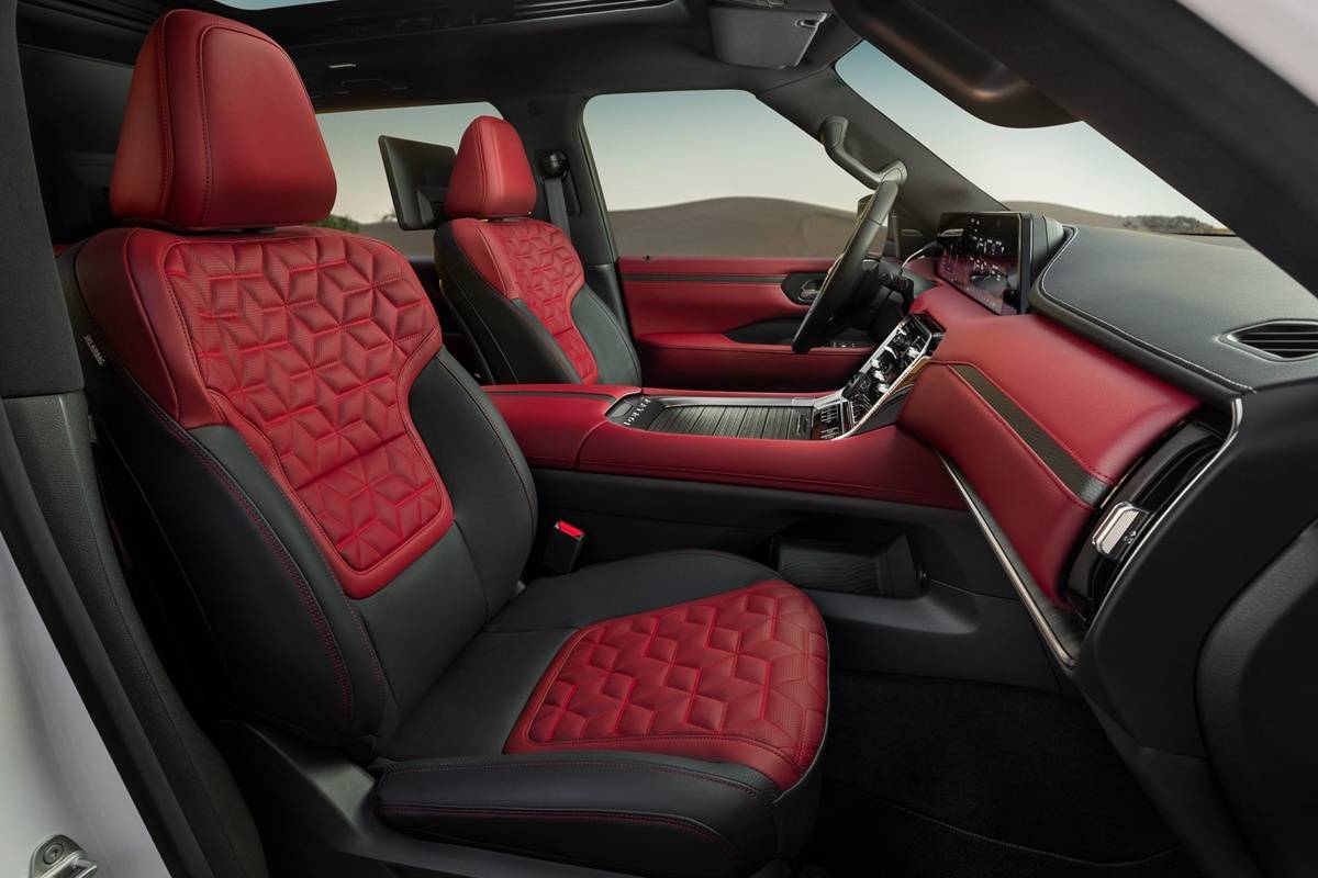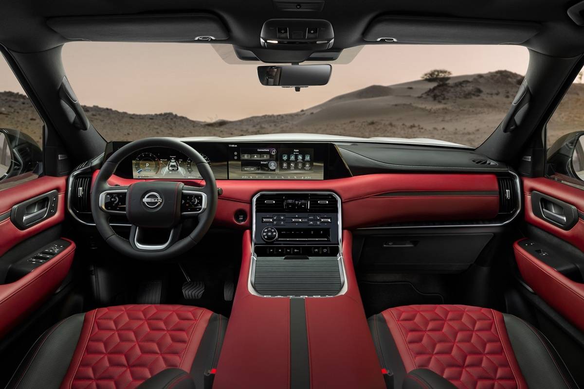 ดีไซน์คอนโซลหน้าต่างจาก INFINITI QX80 ปรับเพื่อให้เป็นรถลุยและหรูในคันเดียวแผงคอนโซลหน้าติดตั้งหนังสัมผัสอย่างประณีตจอคู่รวม 28.6 นิ้วประกอบด้วยจอมาตรวัดความเร็วและจอสัมผัสขนาดใหญ่ฝั่งละ 14.3 นิ้ว