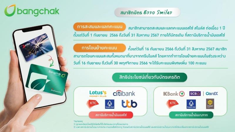สำหรับลูกค้าเอสโซ่ซึ่งเป็นสมาชิกบัตรเอสโซ่สไมลส์ยังสามารถสะสมคะแนนและแลกคะแนนเอสโซ่สไมล์ได้อีก 1 ปีจนถึงวันที่ 31 สิงหาคม 2567 ภายใต้บัตรเดิม หรือสามารถโอนคะแนนสะสมมาเป็นสมาชิกบางจากกรีนไมลส์ โดยจะได้รับคะแนนโบนัสพิเศษเพิ่ม 100 คะแนน หากทำการโอนย้ายคะแนนภายในวันที่ 30 พฤศจิกายน 2566 ทั้งนี้ สำหรับสมาชิกบัตรบางจากกรีนไมลส์ นอกจากจะสามารถนำคะแนนสะสมจากการเติมน้ำมันและซื้อสินค้าในเครือบางจากฯ มาใช้เป็นส่วนลดหรือทำประโยชน์อื่นๆ ตามไลฟ์สไตล์ของตนแล้ว ยังสามารถรับส่วนต่างราคาน้ำมันที่ปรับขึ้นคืนเป็นคะแนนพิเศษเพิ่มเมื่อเติมน้ำมันในวันแรกที่ปรับขึ้นราคา และยังร่วมบริจาคเงินจากการสะสมคะแนนให้กับองค์กรสาธารณประโยชน์ต่าง ๆ ที่บางจากฯ ดำเนินมาต่อเนื่องเป็นปีที่ 18 เพื่อร่วมกันช่วยทำให้สังคมไทยน่าอยู่อย่างยั่งยืนด้วย