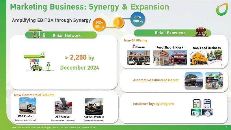 ในขณะที่การให้บริการด้านการตลาดจะครอบคลุมและนำเสนอบริการให้กับลูกค้าได้มากยิ่งขึ้นผ่านเครือข่ายสถานีบริการน้ำมันทั่วประเทศรวมกว่า 2,200 แห่ง โดยเครือข่ายสถานีบริการของเอสโซ่ ผลิตภัณฑ์และน้ำมันเชื้อเพลิงอากาศยาน จะเข้ามาเป็นผลิตภัณฑ์ภายใต้แบรนด์บางจาก สร้างโอกาสในการพัฒนาสถานีบริการให้สอดคล้องกัน ส่งผลให้ผู้บริโภคสามารถเข้าถึงน้ำมันบางจากได้มากขึ้น ซึ่งไม่เพียงส่งผลดีต่อธุรกิจของบางจากฯ เท่านั้น แต่ยังมีความสำคัญต่อภาพรวมของธุรกิจพลังงานในประเทศไทยด้วย