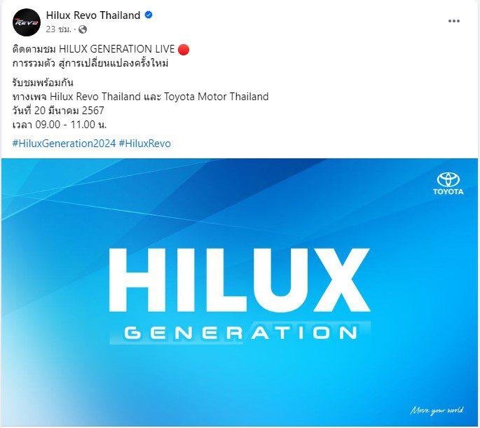 จากที่มีกระแสข่าวเรื่องการเปิดตัว Toyota Hilux REVO ปรับโฉมใหม่ วันที่ 20 มีนาคมนี้ ล่าสุดทางเพจ Hilux Revo Thailand ได้ขึ้นภาพโปรโมท Hilux Generation โดยพื้นหลังเป็นสีฟ้า ซึ่งคาดว่าน่าจะเป็น Mild Hybrid ที่เคยเปิดตัวที่ต่างประเทศไปแล้วก่อนหน้าหน้านี้ รวมถึง Toyota Hilux REVO GR Sport สายโหด 224 ม้า