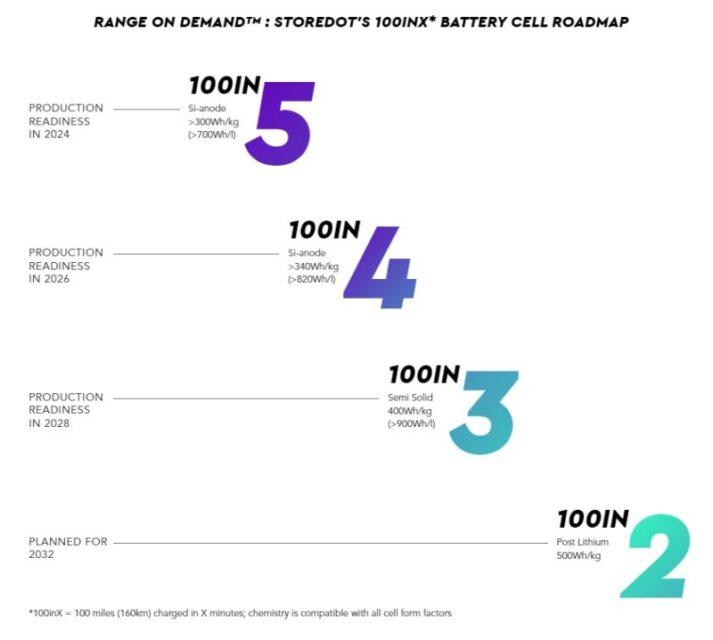 StoreDot สตาร์ทอัพสัญชาติอิสราเอลที่ทำงานเกี่ยวกับเซลล์แบตเตอรี่ชาร์จเร็วสุดขีด (XFC) ที่มีจำหน่ายในท้องตลาด ได้เปิดเผยแนวคิดแบบเซลล์ต่อแพ็ค (CTP) ซึ่งรวมถึงเทคโนโลยี 100in5 ที่เป็นกรรมสิทธิ์ของบริษัท และโซลูชั่นระบายความร้อนที่น่าสนใจ โดยอ้างว่าสามารถชาร์จไฟ 5 นาที ก็สามารถวิ่งได้ระยะทาง 100 ไมล์ หรือ 160 กิโลเมตร