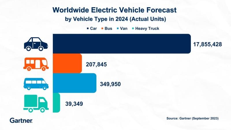 การ์ทเนอร์คาดการณ์ยอดการจัดส่งรถยนต์ขับเคลื่อนด้วยพลังงานไฟฟ้าทั่วโลก (แบบใช้พลังงานจากแบตเตอรี่และแบบปลั๊กอิน-ไฮบริด) ในปี 2023 มีปริมาณเกือบ 15 ล้านคัน และคาดว่าจะเพิ่มขึ้นอีก 19% ในปี 2024 คิดเป็นยอดรวม 17.9 ล้านคัน