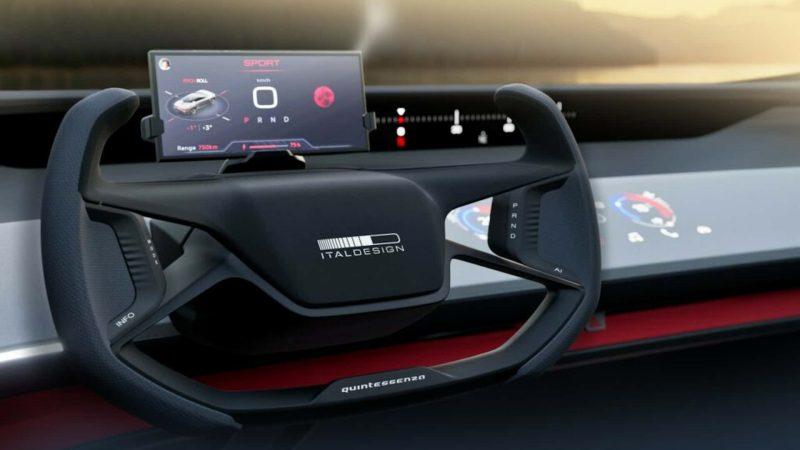 ที่ด้านหน้าห้องโดยสาร แผงหน้าปัดส่วนกลางแบบลอยอยู่ที่ฐานของกระจกหน้ารถ ผสานเข้ากับประตูและพันไปทางด้านหลังของรถ Italdesign สร้างแดชบอร์ดขึ้นมาจากผ้าลายหินอ่อนที่ซ่อนส่วนควบคุมไว้ข้างใต้ โดยใช้ระบบการฉายภาพเพื่อแสดงส่วนควบคุมเหล่านั้น มันฟังดูหรูหราเลยทีเดียว