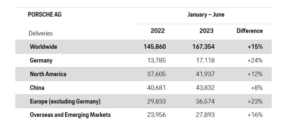 จากยอดส่งมอบรถยนต์ 36,574 คันในยุโรปในช่วงครึ่งแรกของปี 2023 ปอร์เช่สามารถทำตัวเลขได้เพิ่มขึ้นถึง 23% จากช่วงเดียวกันของปีที่ผ่านมา นอกจากนี้ ตลาดในประเทศเยอรมนี ลูกค้าได้รับมอบรถของพวกเขามากกว่าช่วงเดียวกันของปีที่แล้วอย่างมีนัยสำคัญ: ด้วยจำนวน 17,118 คัน คิดเป็นอัตราเพิ่มขึ้นมากถึง 24% ส่วนอเมริกาเหนือมีอัตราการเติบโตเป็นตัวเลข 2 หลักเช่นเดียวกัน ด้วยจำนวน 41,937 คัน เพิ่มขึ้น 12% เมื่อเทียบเป็นรายปี และถึงแม้จะมีสภาพแวดล้อมที่ท้าทายในประเทศจีน แต่ปอร์เช่ก็สามารถส่งมอบรถได้ 43,832 คัน ตั้งแต่เดือนมกราคมถึงมิถุนายน คิดเป็นการเพิ่มขึ้น 8% สำหรับในส่วนตลาดต่างประเทศและตลาดเกิดใหม่ (ตลาดกำลังพัฒนา) มีการส่งมอบรถยนต์ให้กับลูกค้า 27,893 คัน นั่นคือเพิ่มขึ้น 16% เปอร์เซ็นต์