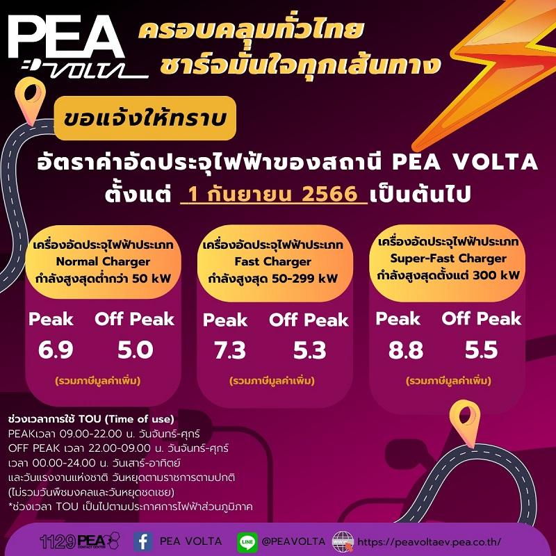 ขอแจ้งให้ทราบอัตราค่าอัดประจุไฟฟ้าของสถานี PEA VOLTA มีผลตั้งแต่วันที่ 1 กันยายน 2566 เป็นต้นไป โดยมีอัตราแบ่งตามขนาดของเครื่องอัดประจุไฟฟ้าทั้งหมด 3 ประเภท คือ