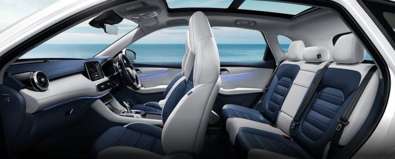 MG HS PHEV ตกแต่งภายในด้วยสี 2-TONE MONACO BLUE ใส่ใจในทุกรายละเอียดด้วยวัสดุ SOFT TOUCH จากแรงบันตาลใจของความงามในธรรมชาติ เบาะหนังคู่หน้าแบบ SPORT- BUCKET SEAT ภายในห้องโดยสารเงียบ เรียบ หรูมีระดับด้วย NVH LUXURY SILENCE SPACE การเพิ่มฟิลกันเสียง และแผ่นชับเสียงกายในห้องโดยสาร ที่จะช่วยตัดเสียงรบกวนภายนอก ให้ทุกการเดินทางเป็นส่วนตัวไปจนถึงหลังคาชันรูฟที่เปิดกว้างแบบพาโนรามา บนพื้นที่เกือบ 90% ของพื้นที่หลังคา จอแสดงผลอังฉริยะ FULL VRTUAL DASHBOARD ขนาด 12 นิ้ว และ หน้าจอ TOUCHSCREEN ขนาด 10 นิ้ว ที่คอนโซลกลาง