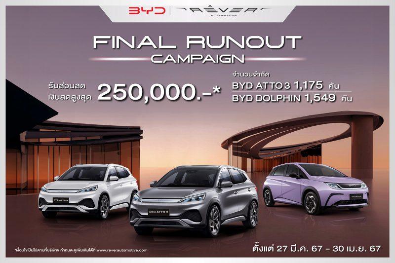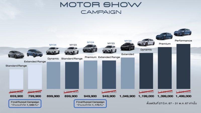 BYD มอบข้อเสนอสุดเอ็กซ์คลูซีฟสำหรับลูกค้าและผู้ที่สนใจซื้อรถยนต์ไฟฟ้า BYD ATTO 3 รุ่นปี 2023 (จำนวนจำกัด 1,175 คัน) และ BYD DOLPHIN (จำนวนจำกัด 1,549 คัน) รับส่วนลดเงินสดสูงสุด 250,000 บาท ตั้งแต่วันที่ 27 มีนาคม พ.ศ. 2567 – 30 เมษายน พ.ศ. 2567 โดยมีรายละเอียดดังนี้