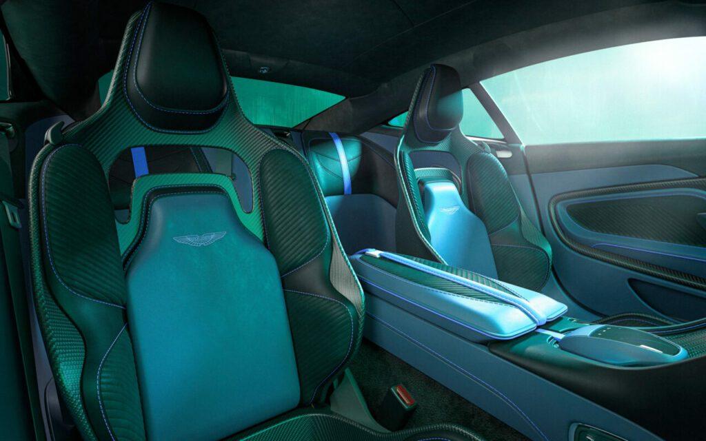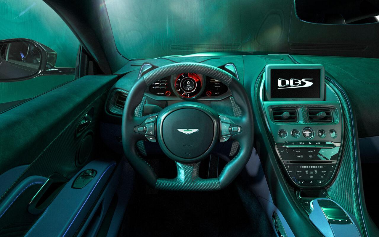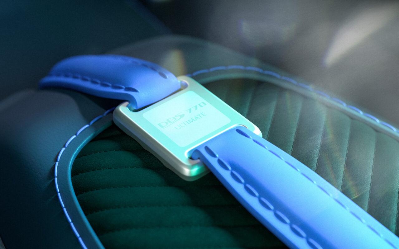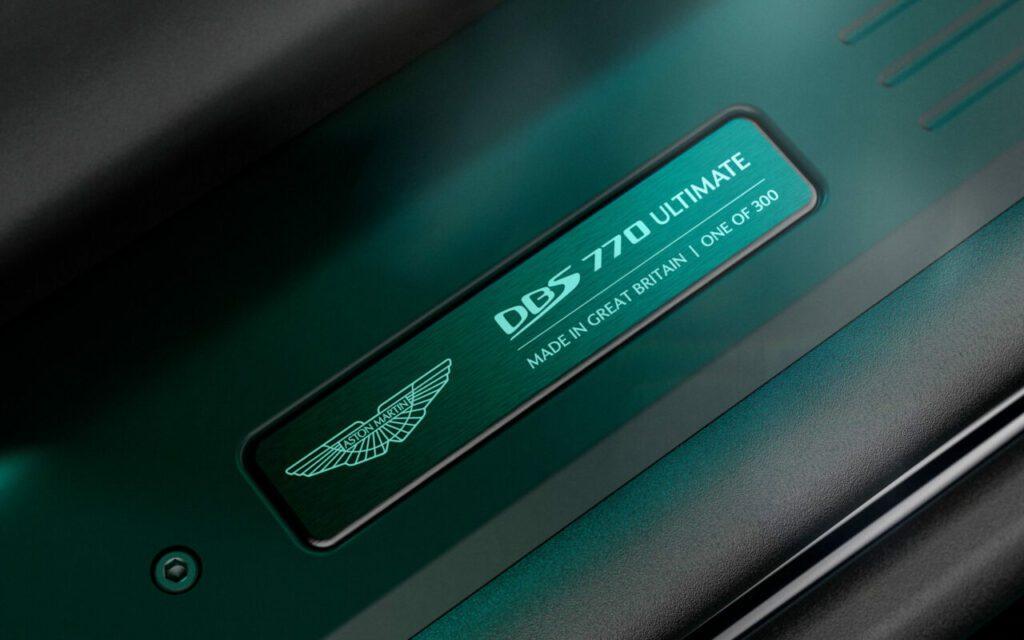 ภายในปะโลโก้พิเศษ DBS 770 Ultimate บนที่วางแขนและชายบันไดแบบพิเศษ รันนัมเบอร์ของรุ่นด้วย มีแป้น Paddle Shift แบบคาร์บอนไฟเบอร์ มีเบาะนั่งหุ้มหนังแท้สลับกับหนังกลับ แต่ถ้าหากไม่ชอบของเดิมๆติดรถก็สามารถสั่งออปชันพิเศษได้จากแผนก Q by Aston Martin ได้
