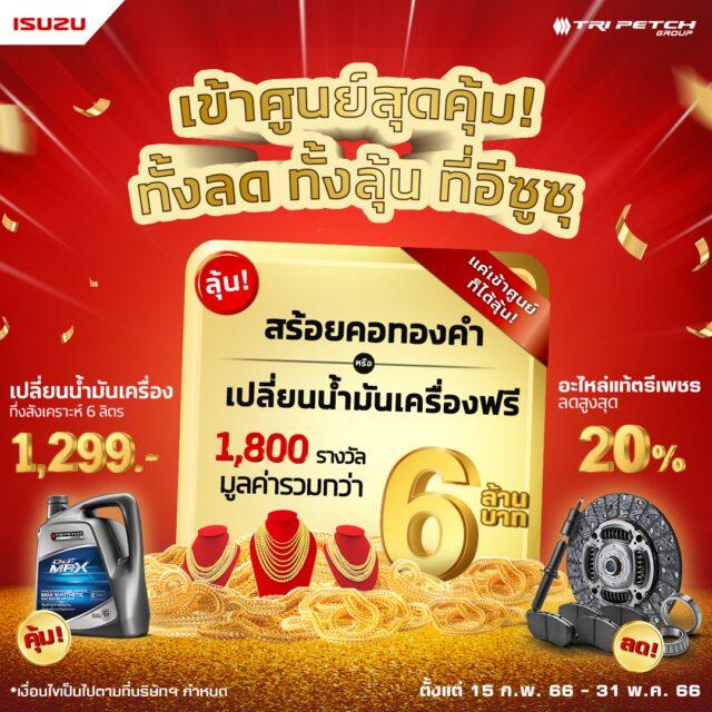 - สิทธิลุ้นรับของรางวัลต่างๆมากมาย อาทิ สร้อยคอทองคำน้ำหนัก 1 บาท สร้อยคอทองคำน้ำหนัก 1 สลึง คูปองเปลี่ยนน้ำมันเครื่องอีซูซุ เกรดกึ่งสังเคราะห์ และเกรดมาตรฐาน พร้อมไส้กรองตรีเพชร รวม 1,820 รางวัล รวมมูลค่าสูงสุดกว่า 6,129,388 บาท โดยรายชื่อลูกค้าบนใบเสร็จรับเงินจะได้รับสิทธิจับรางวัล ตามเงื่อนไขดังนี้