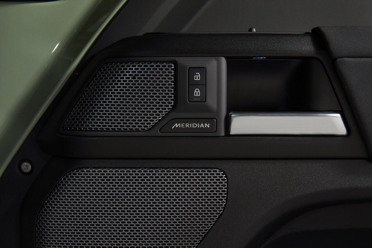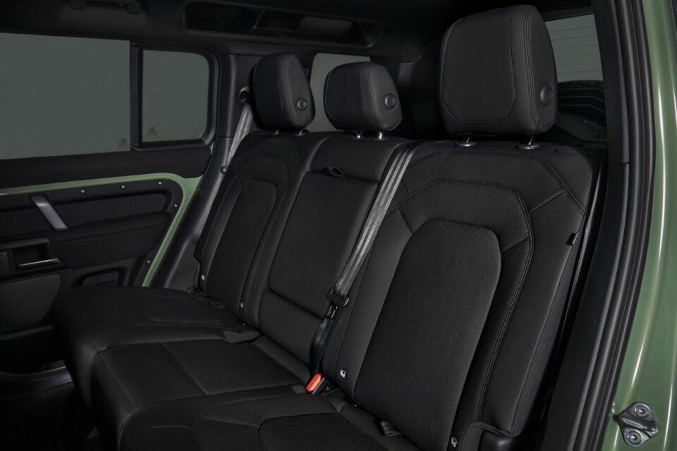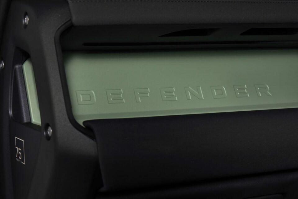 ภายในห้องโดยสารที่อเนกประสงค์ไว้ โดยตกแต่ง Cross Car Beam ด้วยการพ่นสีขาวและมีรายละเอียดการสลักกราฟิกฉลอง 75 ปีด้วยเลเซอร์บนฝาปิดเอนด์แคป เบาะนั่งหุ้มด้วย Resist Ebony บริเวณแผงคอนโซลกลางใช้วัสดุ Robustec ที่เป็นโครงสร้างที่แข็งแรงทนทานที่สุดสำหรับรุ่น Defender