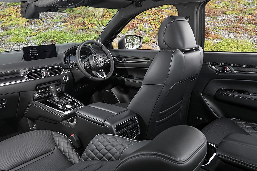 เบาะหนังแท้เกรดคุณภาพแบบ High-Class แบบ 3 ตอน 6 และ 7 ที่นั่ง โทนสีเบจกับสีเทาให้เลือกโดยรุ่น 6 ที่นั่งมาแบบ Exclusive Captain Seat 2 ที่นั่ง 2 ทางเลือก ได้แก่ ห้องโดยสารแบบ 3 แถว 6 ที่นั่ง Captain seat แยกอิสระซ้าย ขวา (Captain seats with center walk-through (6-Seat) สามารถเดินเชื่อมได้ถึงเบาะนั่งแถวที่สาม พร้อมที่วางแก้ว ช่อง USB Type C สำหรับชาร์จไฟ 2 ช่องใต้ บริเวณแผงควบคุมเครื่องปรับอากาศบริเวณเบาะนั่งแถวที่สอง และห้องโดยสารแบบ 3 แถว 6 ที่นั่ง Captain seat ปรับไฟฟ้า (Power captain seats (6-Seat)