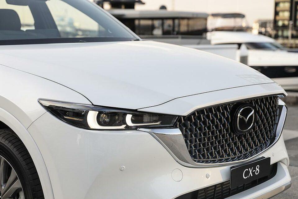 เพื่อต้อนรับเอสยูวีรุ่นใหม่ทั้ง Mazda CX-80 3แถว พื้นฐาน CX-60, Mazda CX-90 3 แถวรุ่นใหญ่ และ Mazda CX-60 สามรุ่นนี้ยกระดับความลักชัวรีเน้นลูกค้ากลุ่มบนด้วยค่าตัวแพงกว่าแต่ยังไง Mazda ยังไม่ทิ้ง Mazda CX-8 อย่างแน่นอนเน้นราคาถูกเจาะกลุ่มครอบครัวที่ต้องการความหรูหราและคุ้มค่าปรับหน้าตาแบบเดียวกับญี่ปุ่นที่ปรับไปช่วงปีกลายตั้งแต่กระจังหน้า Signature Wing พร้อมกรอบกระจังหน้าโครเมียมออกแบบให้ปีกซ้าย-ขวาสั้นลงขนาบข้างกับไฟหน้า LED High-Beam LED รองรับการทำงาน Adaptive LED เป็น 20 ดวง กันชนหน้าออกแบบหรูหราภูมิฐานตัดไฟตัดหมอกหน้า LED ออกไป ไฟท้าย LED ดีไซน์ใหม่รูปตัว L คิ้วโครเมียมเชื่อมไฟท้ายเส้นสายที่หนาขึ้นออกแบบอย่างลงตัว กันชนหลังออกแบบใหม่แผงทับทิมให้อยู่ในตำแหน่งสูงขึ้น ท่อไอเสียคู่