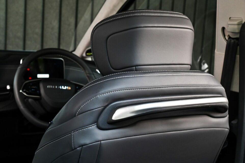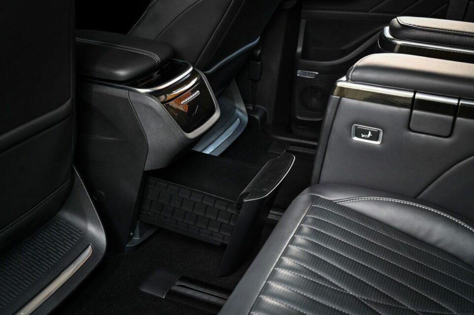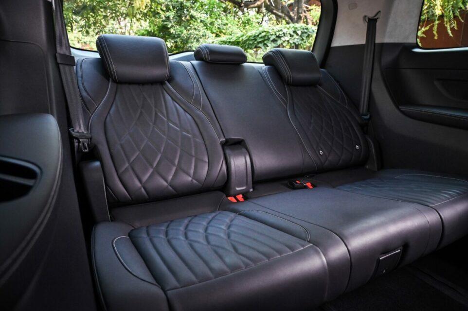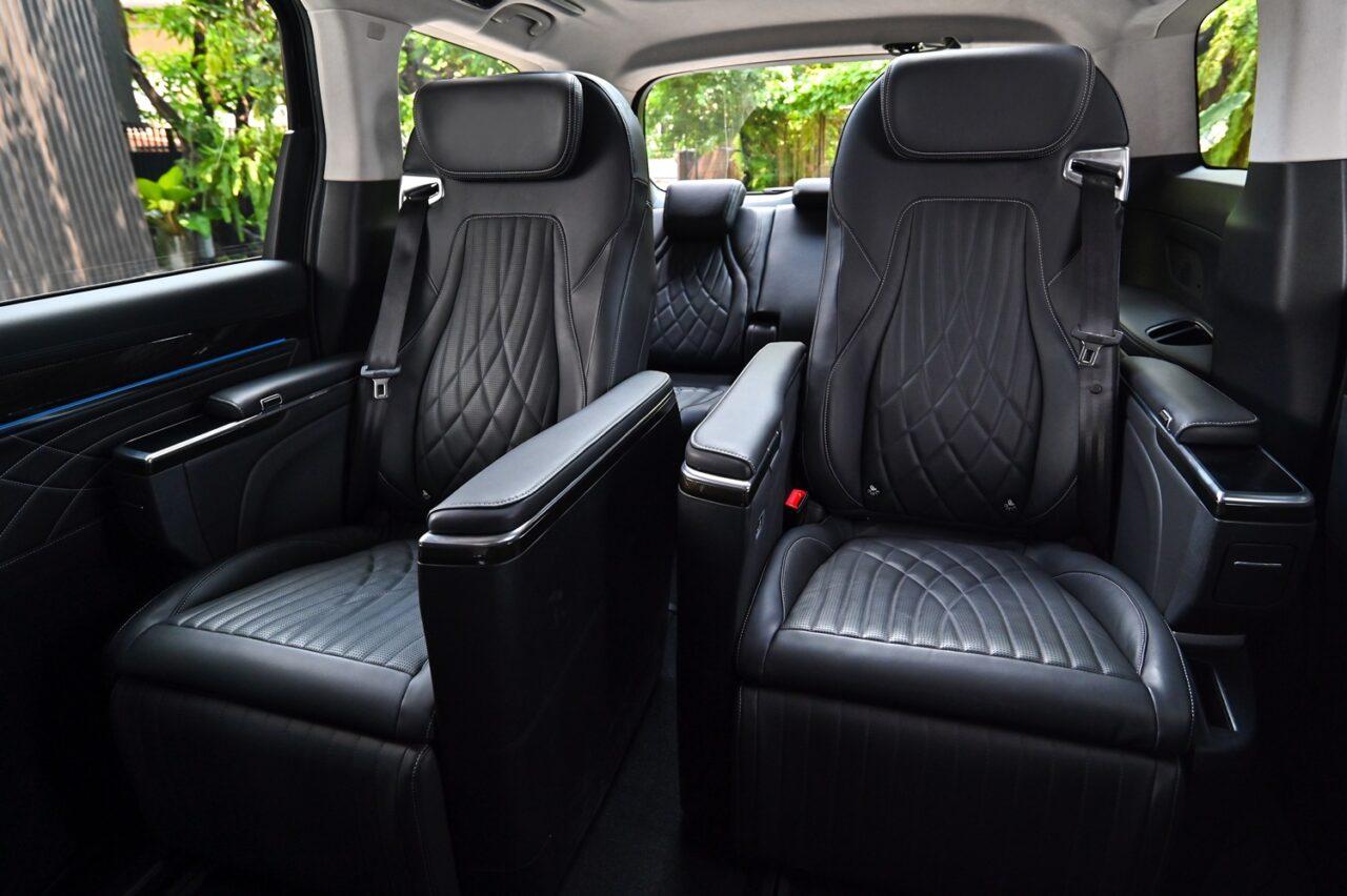 เบาะนั่งหรู 7 ที่นั่ง โดยเบาะนั่งคนขับปรับด้วยระบบไฟฟ้า 8 ทิศทางและฝั่งผู้โดยสารปรับไฟฟ้า 4 ทิศทางมีระบบอุ่นเบาะ ระบายอากาศ นวดเพื่อผ่อนคลาย เช่นกันกับเบาะนั่งแถวที่สองในรุ่น V แบบ VIP Captain Seat พร้อมระบบจดจำตำแหน่งการนั่ง (Memory Seats) ระบบนวดเบาะอุ่นและระบายความร้อนควบคุมผ่านหน้าจอ Touch Screen พร้อมช่องวางโทรศัพท์ โต๊ะพับสามารถใช้งานหลากหลายจะวางโน้ตบุ๊ควางไอแพด หรือเซนต์งานเอกสารได้ตามสะดวกที่วางแก้ว ช่องเสียบ USB และเบาะนั่งตอนที่สามนั่งได้แบบสามที่นั่ง ปรับเลื่อนและพับได้สามารถขนได้ตามใจชอบ ทั้งสามตอนตกแต่งด้วยวัสดุกึ่งหนังแท้สีดำเดินด้ายขาว มีไฟสร้างบรรยากาศภายใน ambient light อย่างอบอุ่นถึง 64 สีและช่องจ่ายไฟ AC Adaptor 220V เบาะนั่งในส่วนของคนขับกับผู้โดยสารออกแบบโครงเบาะให้นั่งสบายโอบกระชับทุกการเดินทาง ส่วนเบาะหลังตอนสองแบบ VIP ออกแบบให้อยู่ตำแหน่งค่อนข้างสูงกว่าชุดเบาะคู่หน้าและถ้าเมื่อยหรือก็จะมีระบบนวดโดยทำงานครั้งหนึ่งครึ่งชั่วโมง