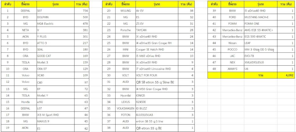 - อันดับที่ 1 อย่าง BYD ทุกรุ่นทั้งหมด 897 คัน แบ่งเป็น BYD Dolphin รุ่น Standard Range 368 คัน รุ่น Extended Range 132 คัน, BYD ATTO 3 รุ่น Extended Range 13 คัน กับรุ่น Standard Range 2 คัน รุ่น MY2023 202 คัน, BYD SEAL รุ่น AWD Extended Range 35 คัน รุ่น RWD Extended Range 93 คัน กับรุ่น RWD Standard Range 52 คัน