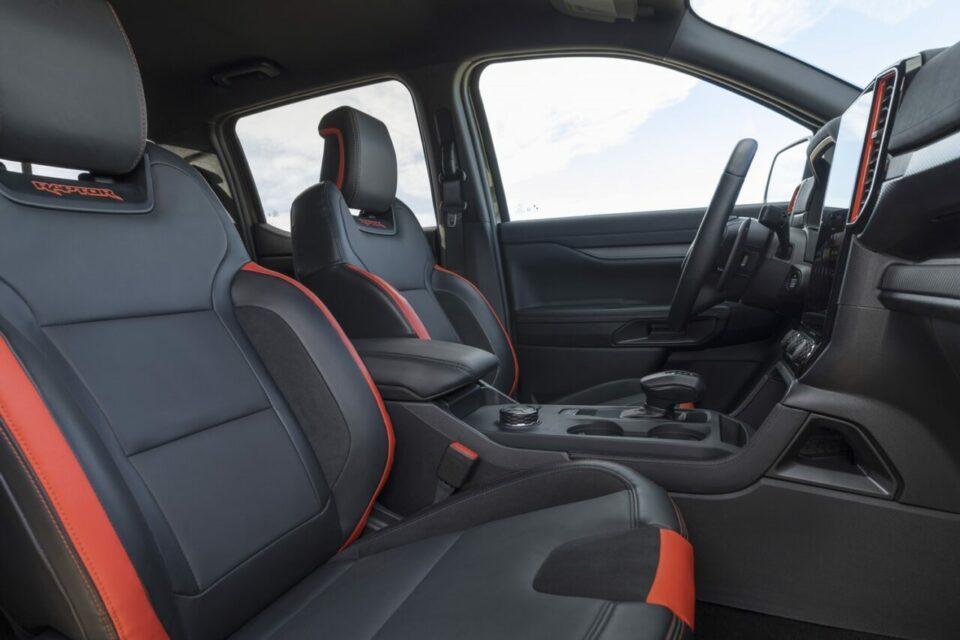 Ford ranger Raptor ขานี้เหมือนเวอร์ชันไทยแน่นอนสำหรับภายในทั้งเบาะที่นั่งแบบสปอร์ตทั้งเบาะหน้าและหลังมอบความสบายและกระชับแม้รถวิ่งด้วยความเร็วบนทางโค้งหุ้มหนังเสริมความหรูหราอีกขั้น ตกแต่งด้วยโทนสีส้ม Code Orange บนแผงหน้าปัด มีไฟส่องสว่าง Ambient Light สีอำพันอบอุ่นภายในห้องโดยสาร พวงมาลัยมัลติฟังก์ชันหุ้มหนังเกรดพรีเมียมพร้อมแถบบอกตำแหน่งองศาพวงมาลัยหรือ On-centre mark กับแป้น Paddle Shift เคลือบแมกนีเซียม