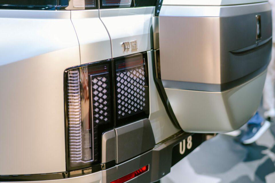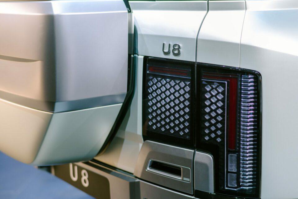 YANGWANG U8 ดีไซน์คล้ายกับคู่แข่งโซนยุโรปทั้ง Land Rover Defender หรือ Mercedes-Benz G-Class เริ่มที่ด้านหน้ากับกระจังหน้าดีไซน์หรูซับซ้อนแบบตะแกรงพร้อมไฟเลี้ยววิ่งอยู่บนขอบบังโคลนหน้าซ้าย-ขวา ถัดลงมาเป็นชุดไฟหน้า LED แบบ Dual ทรงเลขเจ็ด ในชุดกันชนหน้าสีเดียวกับตัวรถ หลังคารถมีดีไซน์นูนๆส่วนหน้าออกมาสามจุด ด้านท้ายแน่นอนว่าคล้ายกับ Land Rover Defender หรือ Mercedes-Benz G-Class ในส่วนของที่ห้อยยางอะไหล่บนฝาท้ายรวมถึงไฟท้าย LED ทรงเลขเจ็ดคล้ายกับด้านหน้า
