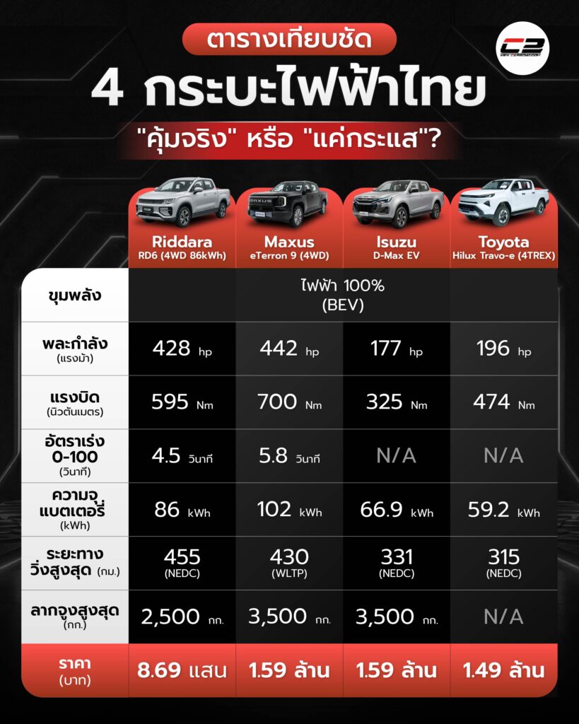 ตารางเปรียบเทียบ 4 กระบะไฟฟ้าขายในไทย