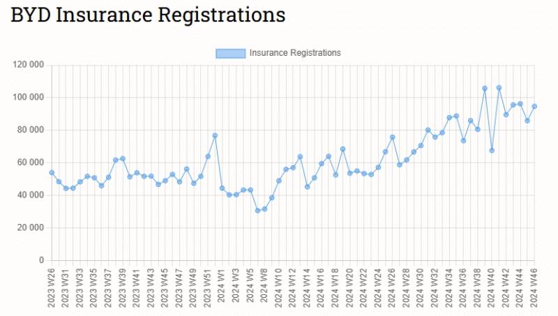 - BYD จดทะเบียนรถยนต์จำนวน 94,700 คัน เพิ่มขึ้น 10.2% จากสัปดาห์ก่อน และเมื่อเทียบเป็นรายปี BYD จดทะเบียนเพิ่มขึ้น 79.0%