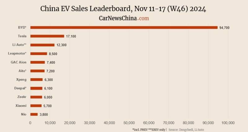 ในสัปดาห์ที่ 46 ของปี 2024 ในช่วงเดือนพฤศจิกายน ตลาดรถยนต์ไฟฟ้าในจีนส่วนใหญ่เติบโต โดย BYD เติบโต 10% และ Xiaomi เติบโต 4% ในขณะที่ Tesla ลดลง 1.2% จากสัปดาห์ก่อนหน้า
