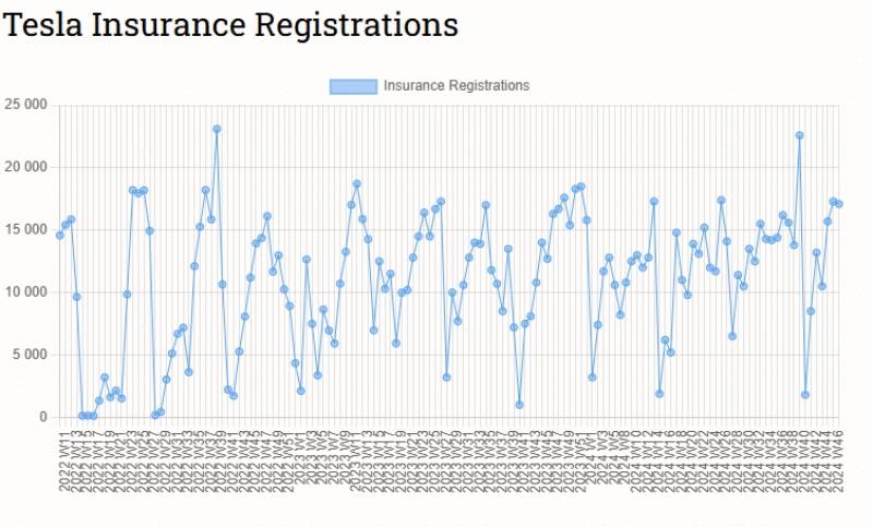 2. Tesla จดทะเบียนรถยนต์จำนวน 17,100 คัน ลดลง 1.2% จากสัปดาห์ก่อน และเมื่อเทียบเป็นรายปี Tesla จดทะเบียนเพิ่มขึ้น 4.9%