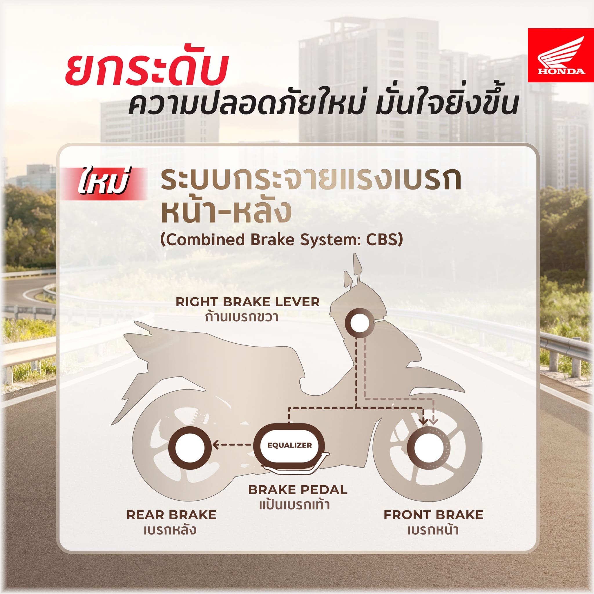 • ระบบเบรก CBS (Combined Brake System) ช่วยให้การเบรกนุ่มนวลและปลอดภัยกว่าเดิม