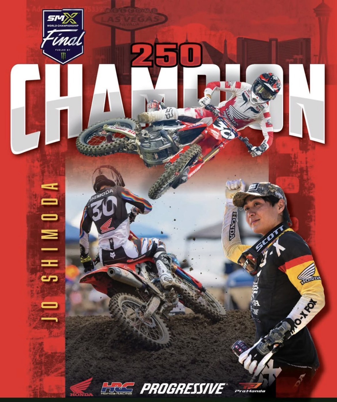 ในการแข่งขันคลาส 250SMX ด้วยผลงานของ “โจ ชิโมดะ” ด้วยตัวแข่ง Honda CRF250R เก็บชัยชนะในเรซที่ 1 และโพเดียมอันดับที่ 2 ในเรซที่สอง บวกคะแนนสะสมผงาดคว้าแชมป์โลกในคลาส 250SMX ไปครองได้สำเร็จ ตอกย้ำความแข็งแกร่งของฮอนด้าในสังเวียนทางฝุ่นและสุดยอดตัวแข่งจาก CRF Series