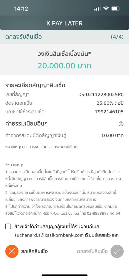 หมายเหตุ: หากลูกค้ามียอดหนี้ค้างชำระ หรือใช้วงเงิน K PAY LATER ไม่เป็นไปตามวัตถุประสงค์ หรือเงื่อนไขที่ตกลงไว้กับธนาคาร เช่น การเบิกใช้วงเงิน แต่ไม่มีการซื้อขายสินค้า/บริการจริง เป็นต้น อาจส่งผลกระทบต่อการพิจารณาสินเชื่อ หรือการสมัคร / ใช้ผลิตภัณฑ์อื่นๆ ของธนาคาร รวมถึงธนาคารมีสิทธิระงับการใช้วงเงิน K PAY LATER ของลูกค้าได้