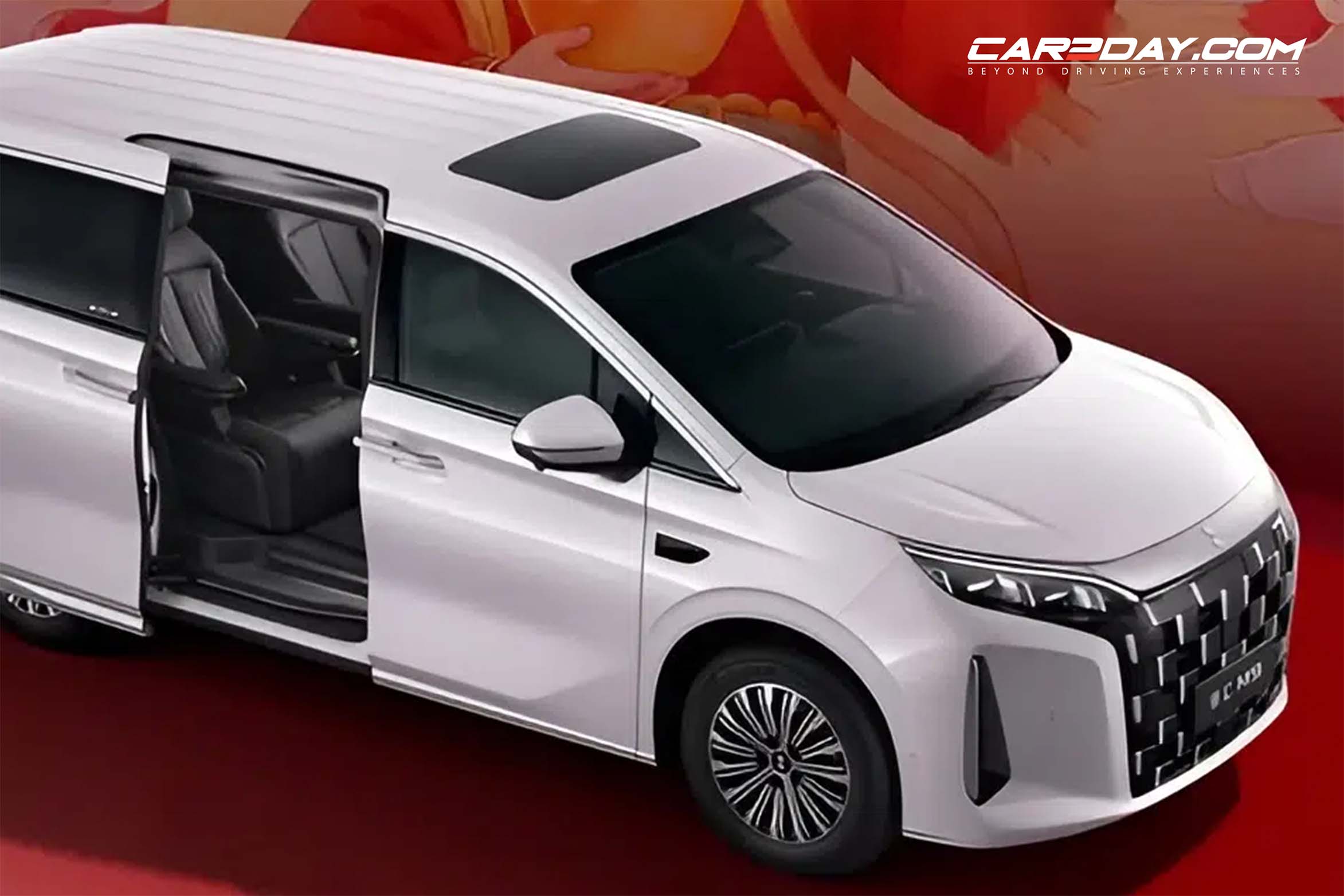 LINGHUI M9 จาก BYD M9 มีโลโก้เฉพาะแบรนด์แล้วกระจังหน้าไส้ในเป็นโครเมียมแนวตั้งในชุดกระจังหน้าทรงสี่เหลี่ยมคางหมู เพิ่มดีไซน์ช่องระบายอากาศในบังโคลนซ้าย-ขวา หลังคาซันรูฟบานเดียว