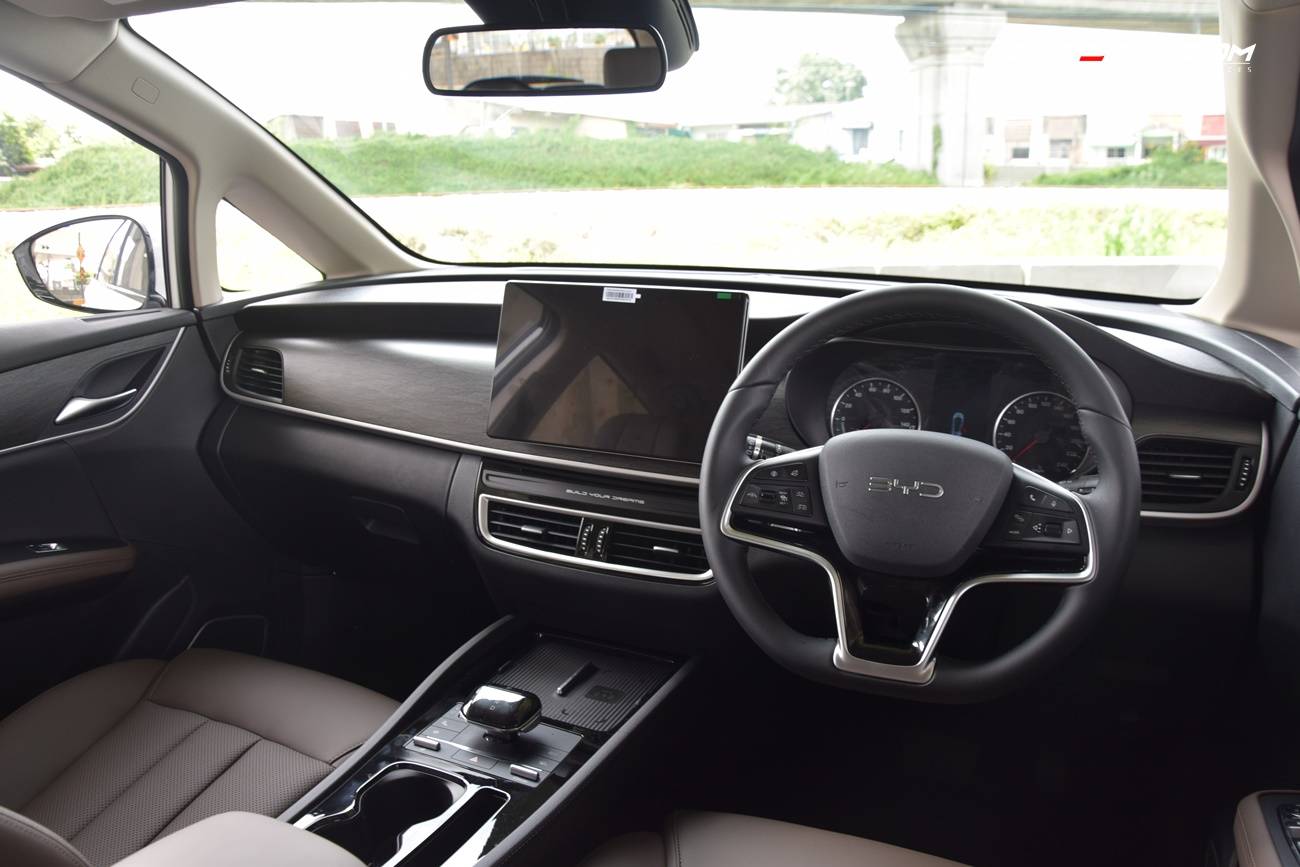 คอนโซลหน้าดีไซน์คุ้นเคยจาก BYD e6 หรูเล่นลายเกล็ดมีหน้าจอทัชสกรีนขนาดใหญ่ 12.8 นิ้ว หมุนปรับจากแนวนอนเป็นแนวตั้งได้ด้วยระบบไฟฟ้า รองรับระบบ Apple CarPlay® และ Android Auto™ พร้อมระบบนำทางในจอ เชื่อมต่อมือถือผ่านบลูทูธ มีช่องเสียบ USB Type A และ Type C อย่างละ 1 จุด รวม 4 จุดทั้งตอนหน้าและตอนที่ 2 พร้อมลำโพงรอบคัน 6 จุด มาตรวัดสี TFT ขนาดใหญ่ 5 นิ้ว