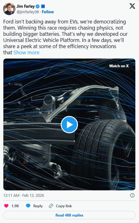 โดย Farley ได้โพสต์ VDO บนโซเชียลมีเดียว่า Ford ไม่ได้ถอยจาก EV แต่กำลังทำให้ EV เข้าถึงได้ง่ายขึ้น พร้อมระบุว่าการ0tชนะการแข่งขันต้องแก้ที่ด้านฟิสิกส์และต้นทุน ไม่ใช่แค่การเพิ่มขนาดแบตเตอรี่ จึงเป็นเหตุผลในการพัฒนา Universal Electric Vehicle Platform
