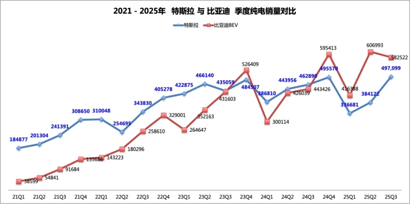 BYD สามารถสร้างความได้เปรียบเหนือ Tesla ในตลาดรถยนต์ไฟฟ้าล้วน ทั่วโลกตลอดช่วงสามไตรมาสแรก ของปี 2025