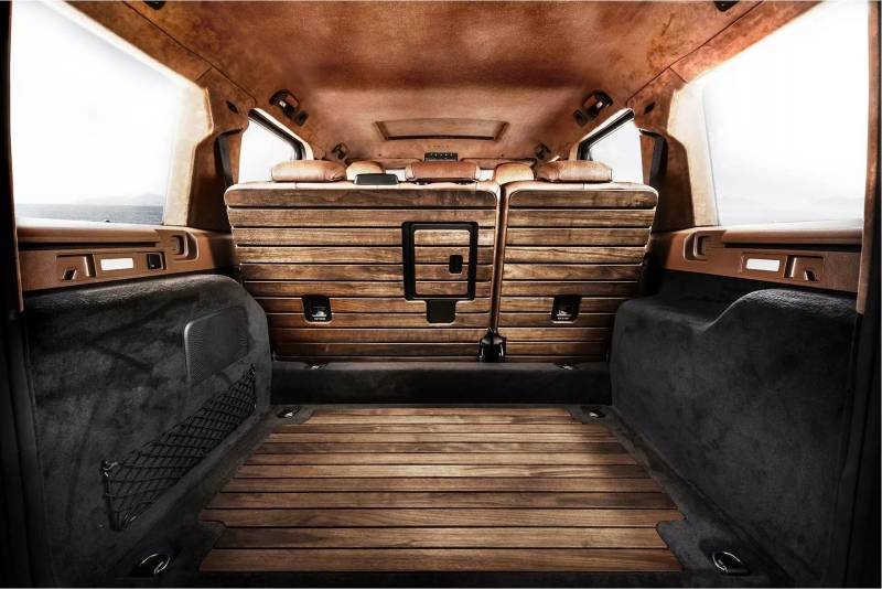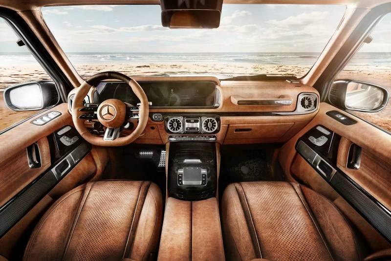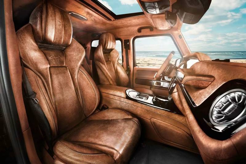 Carlex ซึ่งเป็นผู้เชี่ยวชาญด้านการตกแต่งภายในชั้นนำ ได้ปรับปรุงห้องโดยสารของ G-Wagon ด้วยเช่นกัน โดยแทบทุกแผงหุ้มด้วยหนังวินเทจและ Alcantara มีให้เลือก 3 สี สไตล์ของหนังวินเทจนี้ช่วยเพิ่มความรู้สึกย้อนยุคให้กับรถ 4×4 และเข้ากันได้เป็นอย่างดี นอกจากนี้ ผู้ปรับแต่งยังได้สร้างสรรค์พื้นที่เก็บสัมภาระด้านหลังของ G-Class อีกด้วย โดยประดับพื้นด้วยแผงไม้ ซึ่งเป็นคุณลักษณะที่เลียนแบบมาจากด้านหลังของเบาะหลัง