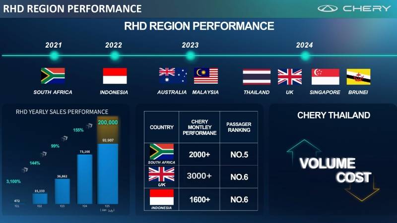 เชอรี เริ่มต้นจำหน่ายรถยนต์พวงมาลัยขวา (RHD) เมื่อปี 2021 เริ่มที่ประเทศแอฟริกาใต้ ต่อมาปี 2022 ที่ประเทศอินโดนีเซีย ปี 2023 ที่ประเทศออสเตรเลีย และมาเลเซีย ปี 2024 ที่ประเทศไทย สหราชอาณาจักร สิงคโปร์ และบรูไน สามารถทำยอดขายเติบโตขึ้นเป็นเท่าตัว โดยเฉพาะในสหราชอาณาจักร และคาดว่าจะขายได้ถึง 200,000 คัน ภายในสิ้นปีนี้