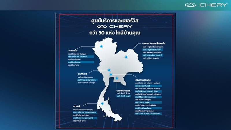 ในการเข้ามาดำเนินธุรกิจในประเทศไทย CHERY มุ่งมั่นในแผนการลงทุนระยะยาว ผ่านการสร้างเครือข่ายพันธมิตรตัวแทนจำหน่ายมากกว่า 30 แห่งทั่วประเทศ ควบคู่กับการนำเสนอผลิตภัณฑ์ที่ตอบโจทย์ความต้องการของผู้ใช้รถยนต์ชาวไทย และบริการหลังการขายที่ได้มาตรฐานระดับสูง โดยมีคลังเก็บอะไหล่ที่พร้อมจัดส่งให้ศูนย์บริการทั่วประเทศ รวมทั้งยึดมั่นการนำเสนอราคารถยนต์ที่เหมาะสมและคุ้มค่าให้กับลูกค้าชาวไทย โดยไม่มีนโยบายแข่งขันในสงครามราคา
