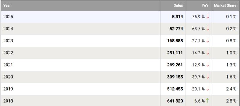 และนั่นอาจยังไม่ถึงระดับต่ำสุด ใน 4 เดือนแรกของปี 2025 เชฟโรเลตขายรถได้เพียง 5,314 คัน ลดลงถึง 75.9% จากช่วงเดียวกันของปีก่อน ซึ่งคิดเป็นยอดขายเฉลี่ย 1,300 คันต่อเดือน