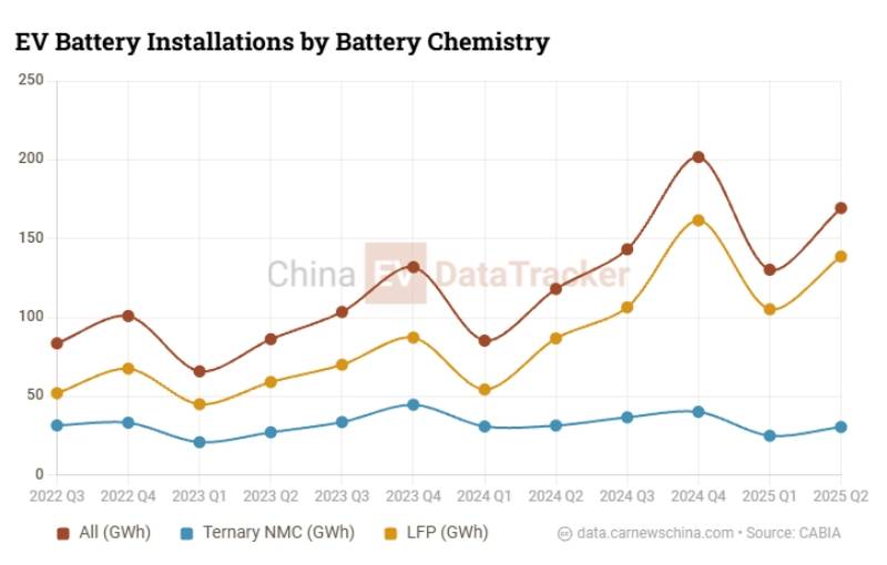 ในช่วงครึ่งแรกของปี 2025 แบตเตอรี่ LFP มีส่วนแบ่ง 81.4% ในขณะที่ NMC ลดลงเหลือ 18.5% ในรถยนต์ที่ผลิตในจีน
