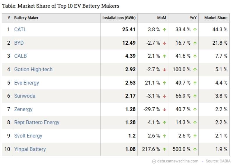 อันดับสามคือ CALB ด้วยส่วนแบ่ง 7.7% และเติบโต 41.6% และอันดับสี่คือ Gotion High-tech ที่ได้รับการสนับสนุนจาก Volkswagen ด้วยส่วนแบ่ง 5.1% และเติบโต 100% เมื่อเทียบกับปีที่แล้ว