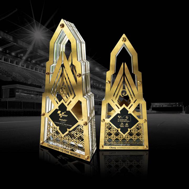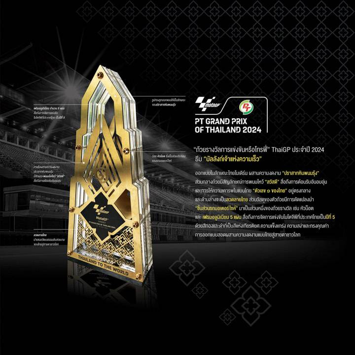 พร้อมกันนี้ยังได้เปิดตัว “ถ้วยรางวัลการแข่งขันหรือโทรฟี่” ThaiGP ประจำปี 2024 ด้วยธีม “บัลลังก์เจ้าแห่งความเร็ว” ลักษณะไทยโมเดิร์น ผสานความงดงาม “ปราสาทหินพนมรุ้ง” ส่วนกลางถ้วยมีสัญลักษณ์การพนมไหว้ “สวัสดี” สื่อถึงการต้อนรับอันอบอุ่นและการให้ความเคารพในแบบไทย “ตัวเลข ๑ ของไทย” อยู่ตรงกลางและด้านล่างจะเป็นลวดลายไทย ส่วนวัสดุของตัวถ้วยมีการดัดแปลงนำ “ชิ้นส่วนรถมอเตอร์ไซค์” มาเป็นส่วนหนึ่งของถ้วยรางวัล เช่น ตัวน็อต และ เฟรมอลูมิเนียม 5 แผ่น สื่อถึงการจัดการแข่งขันโมโตจีพีที่ประเทศไทยเป็นปีที่ 5 ด้วยสีทองและดำที่เป็นสีแห่งเกียรติยศ ความแข็งแกร่ง ความสง่าและทรงคุณค่า การออกแบบสอดผสานความงดงามแบบไทยสู่สายตาชาวโลก