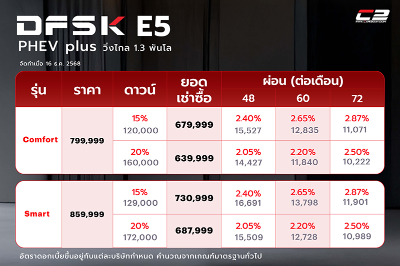 ตารางผ่อน ดาวน์ DFSK E5 Plus PHEV วิ่งไกล 1.3 พันโล ผ่อนเริ่มต้น 10,xxx บ.