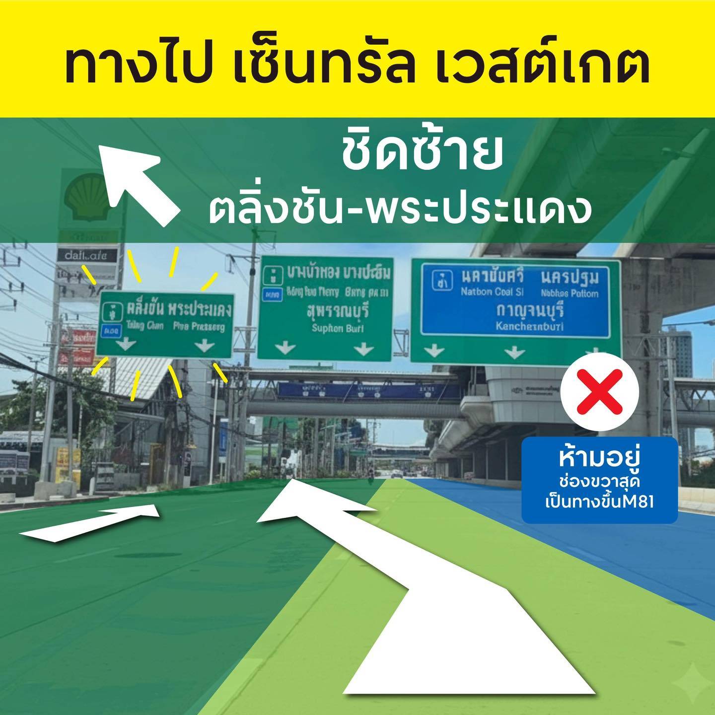อันดับแรก หากวิ่งมาจากเส้นรัตนาธิเบศร์ เมื่อขับมาถึงบริเวณสถานีรถไฟฟ้า MRT บางใหญ่ ให้คอยสังเกตป้ายดีๆ เมื่อเห็นป้าย ตลิ่งชัน-พระประแดง ให้ขับชิดซ้ายเข้าช่องทางตลิ่งชัน-พระประแดง ซึ่งอยู่สองเลนซ้ายสุด เพราะในช่องทางนี้จะมีช่องทางกลับรถไปยังเซ็นทรัล เวสต์เกต ห้ามขับในเลนกลางหรือเลนขวาสุดเด็ดขาด โดยเฉพาะเลนขวาสุดที่เป็นทางขึ้นมอเตอร์เวย์ M81 ที่หลายๆ คนผวากัน ถ้าขึ้นทางนี้ก็เตรียมชุดว่ายน้ำไปล่องแพที่กาญจนบุรีได้เลย