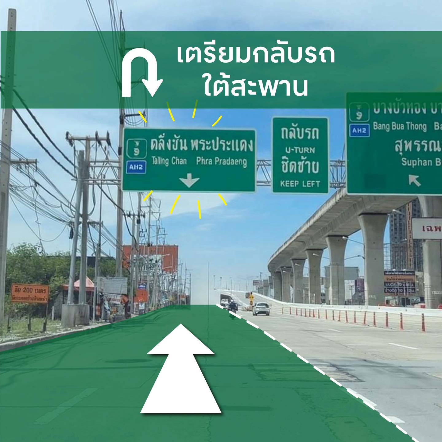 ขับต่อมาอีกสักพักจะเห็นช่องทางที่ใช้กลับรถใต้สะพาน ให้ขับชิดขวาไว้เพื่อเตรียมกลับรถ ย้ำอีกครั้งว่าห้ามขับชิดซ้ายตามป้ายก่อนหน้านี้เป็นอันขาด ไม่อย่างนั้นจะไปโผล่ที่ตลิ่งชัน-พระประแดงแทน