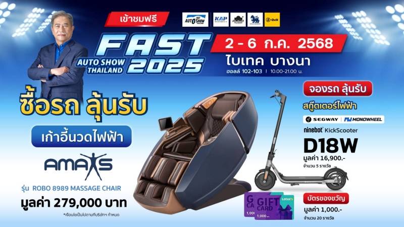 - ลุ้นเป็นผู้โชคดีเมื่อซื้อรถในงาน “ฟาสต์ ออโต โชว์ ไทยแลนด์ 2025” กับกิจกรรม “ซื้อรถ ลุ้นรับ” โดยผู้จองรถและซื้อรถในงาน ทุก 100,000 บาท รับคูปอง 1 ใบ ได้สิทธิ์ลุ้นรับรางวัลใหญ่ “เก้าอี้นวดไฟฟ้ารุ่น ROBO 8989 Massage Chair” จาก เอแม็กซ์ (Amaxs) มูลค่า 279,000 บาท จำนวน 1 รางวัลหลังจบงาน