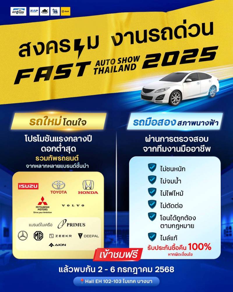 Fast Auto Show 2025 เปิดฉากตอกย้ำบทบาทสำคัญในฐานะเวทีขับเคลื่อนอุตสาหกรรมยานยนต์ช่วงกลางปี ด้วยจุดแข็งในการรวมค่ายรถยนต์ชั้นนำและรถยนต์ใช้แล้วคุณภาพดีไว้ในที่เดียว พร้อมข้อเสนอพิเศษที่กระตุ้นกำลังซื้อของผู้บริโภคในคอนเซ็ปต์ “รถใหม่โปรโดนใจ รถมือสองไมล์แท้รับประกันซื้อคืน” เปิดพื้นที่คุณภาพช่วยผลักดันยอดขายช่วงครึ่งปีหลัง ด้วยโปรโมชั่นแรงจาก 10 แบรนด์รถใหม่ และ 5 ผู้ประกอบการรถยนต์ใช้แล้วชั้นนำ เข้าชมฟรี ไม่มีค่าใช้จ่าย 10 โมงเช้า – 3 ทุ่ม วันที่ 2 – 6 กรกฎาคม 2568 นี้ ณ ศูนย์นิทรรศการและการประชุมไบเทค บางนา