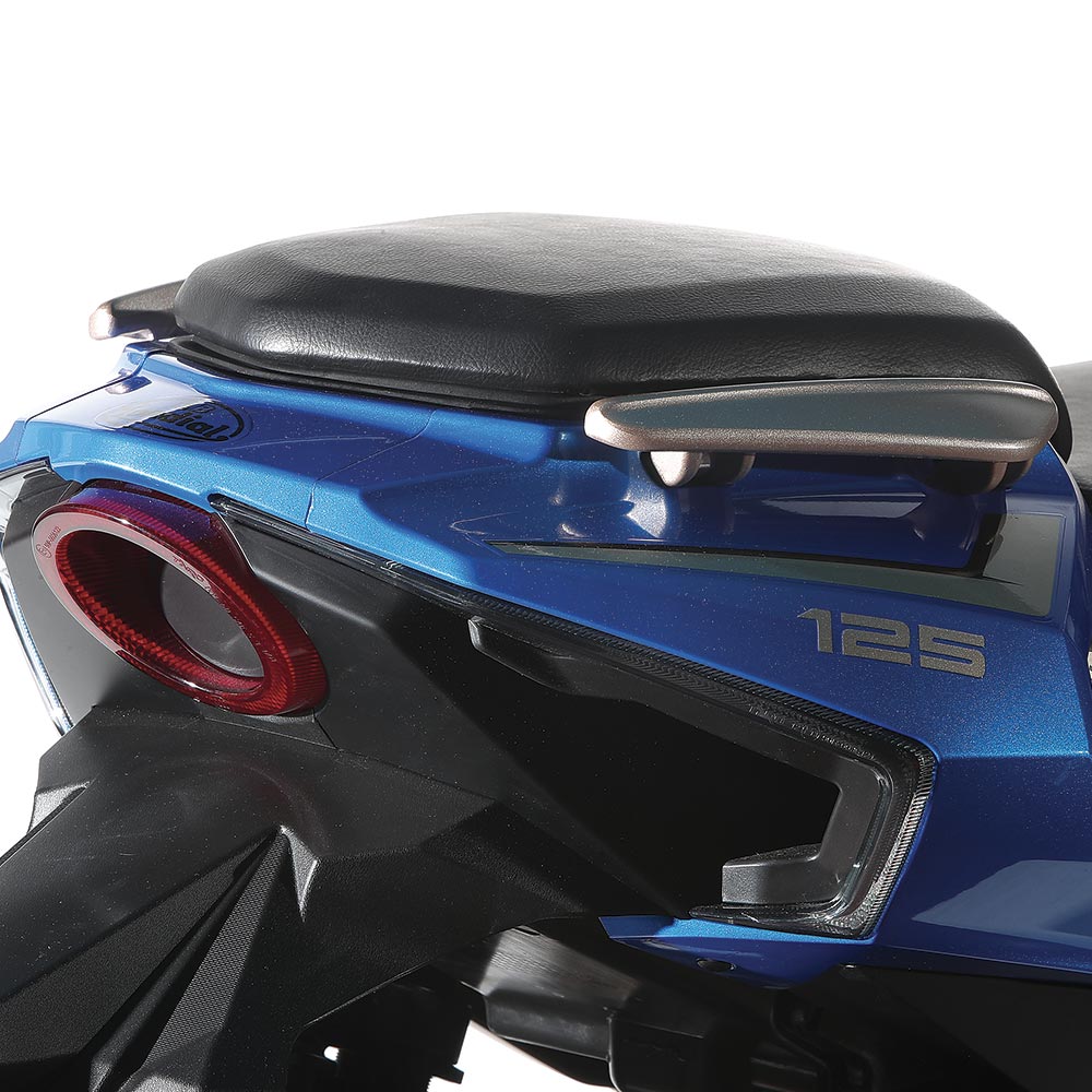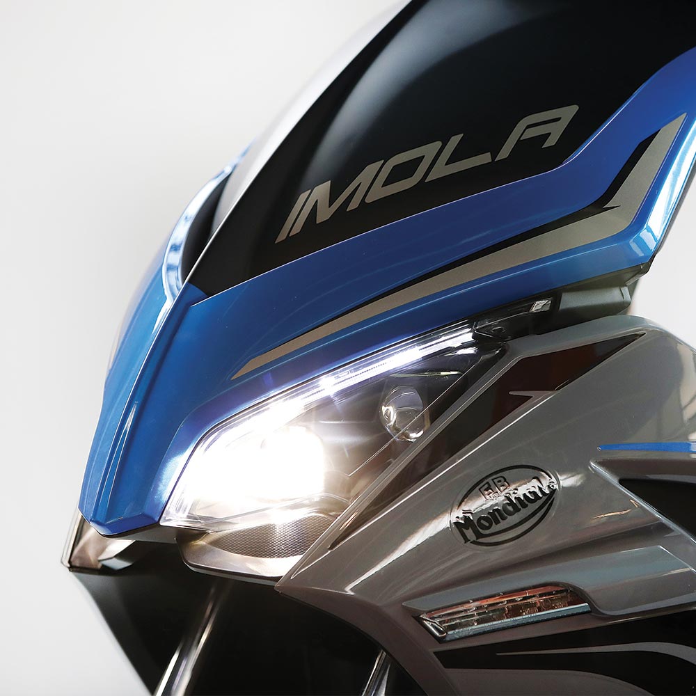 จุดเด่นที่สะดุดตาที่สุดคือ ชุดไฟหน้า LED ทรงรี 4 ดวง จัดวางแบบสมมาตร สร้างภาพลักษณ์ดุดันและสปอร์ต ชวนให้นึกถึงรถแข่งยุค 90 อย่างชัดเจน ทำให้ Mondial Imola 125 แตกต่างจากสกู๊ตเตอร์ 125cc รุ่นอื่นในตลาด
