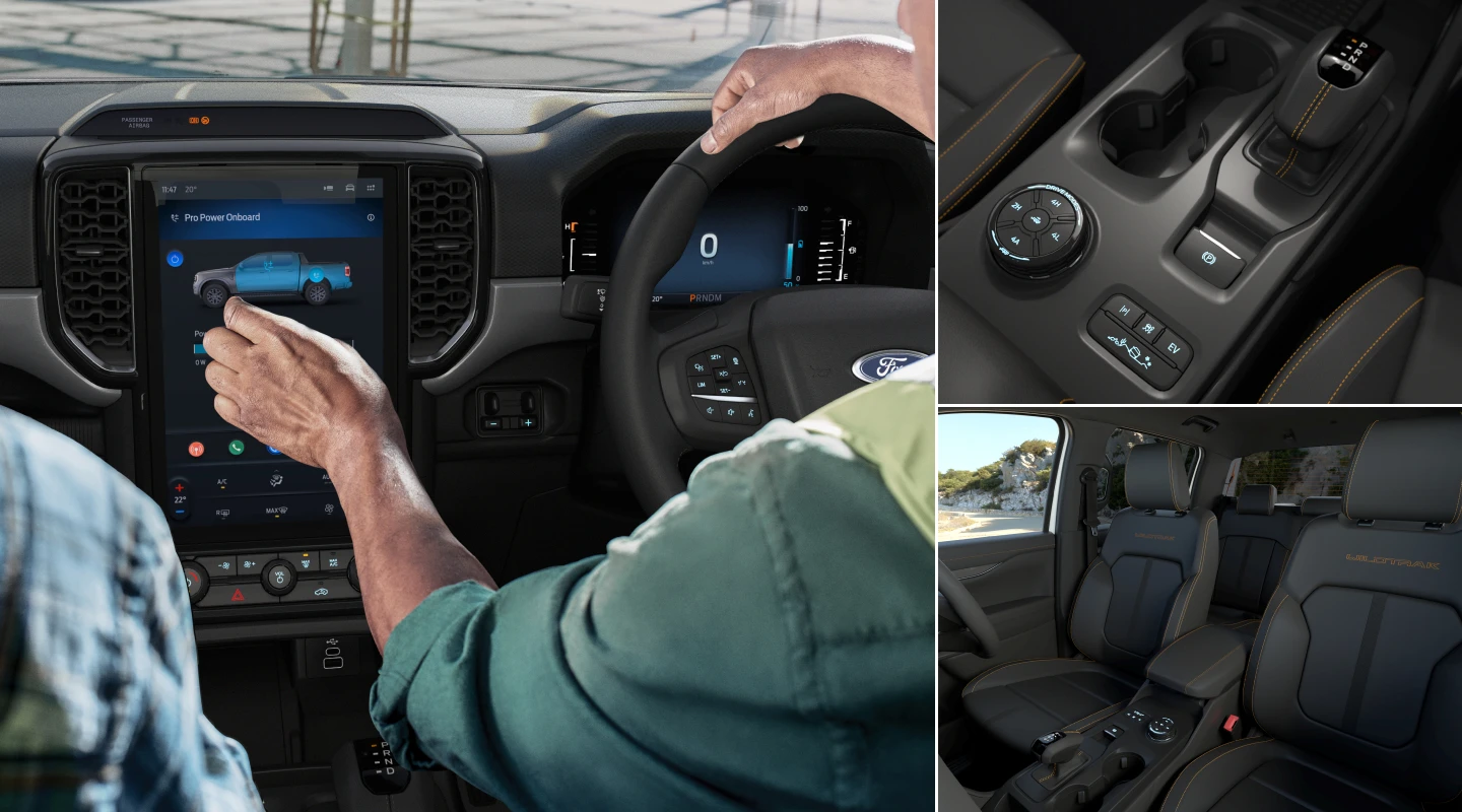 ส่วนรุ่น WILDTRAK ตั้งแต่ชุดแผงคอนโซลหน้าหุ้มหนังสัมผัส พวงมาลัยมัลติฟังก์ชันสามก้านคู่หุ้มหนัง และชุดเบาะนั่งกึ่งหนังแท้ดำขลิบส้ม ทั้ง 2 รุ่นมาพร้อมเบาะนั่งคนขับและผู้โดยสารตอนหน้าสามารถปรับไฟฟ้าได้ถึง 8 ทิศทาง แท่นชาร์จไร้สายกุญแจรีโมทอัจฉริยะพร้อมปุ่มสตาร์ทรถอัตโนมัติ