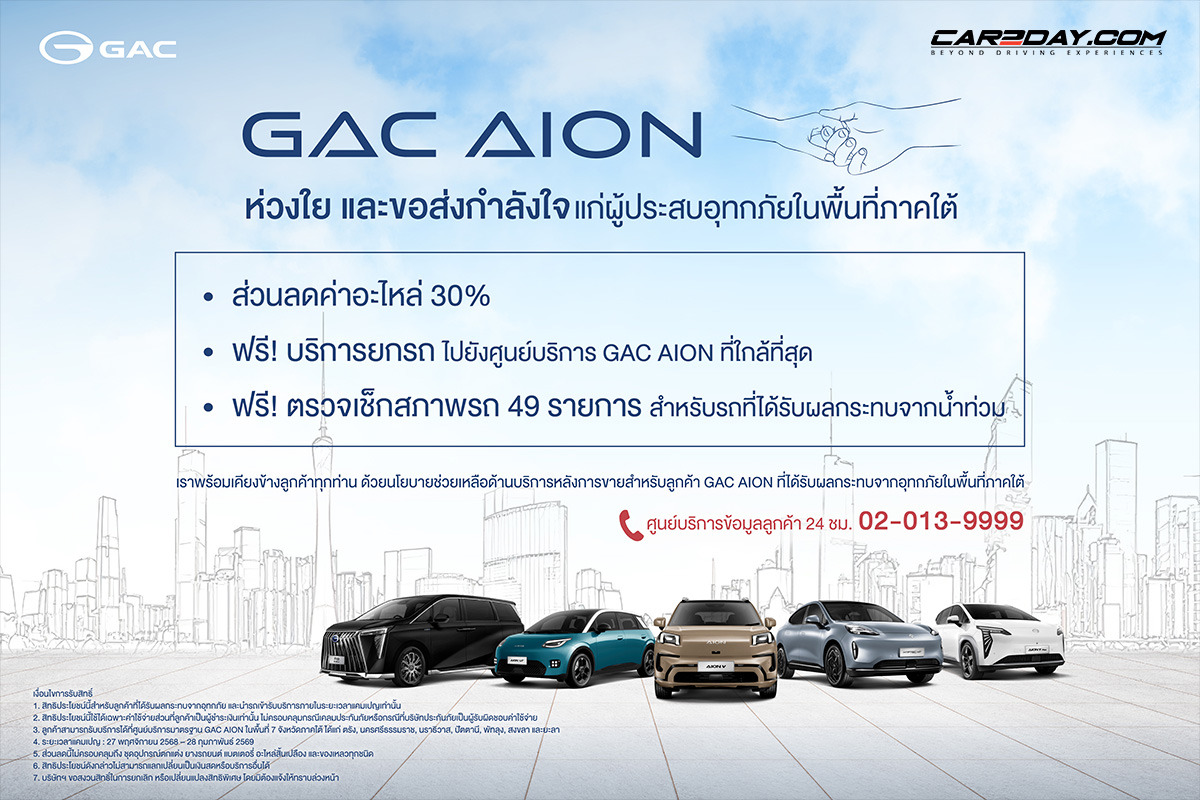 GAC AION Thailand ขอส่งกำลังใจและความห่วงใยอย่างสุดซึ้งไปยังพี่น้องประชาชนและลูกค้าในพื้นที่ภาคใต้ที่กำลังเผชิญวิกฤตอุทกภัย โดยบริษัทฯ ตระหนักถึงความเดือดร้อนและต้องการเป็นส่วนหนึ่งในการช่วยเหลือแบ่งเบาภาระค่าใช้จ่าย พร้อมดูแลรถยนต์ของท่านให้กลับมาใช้งานได้อย่างปลอดภัยโดยเร็วที่สุด จึงขอมอบมาตรการช่วยเหลือพิเศษ ดังนี้