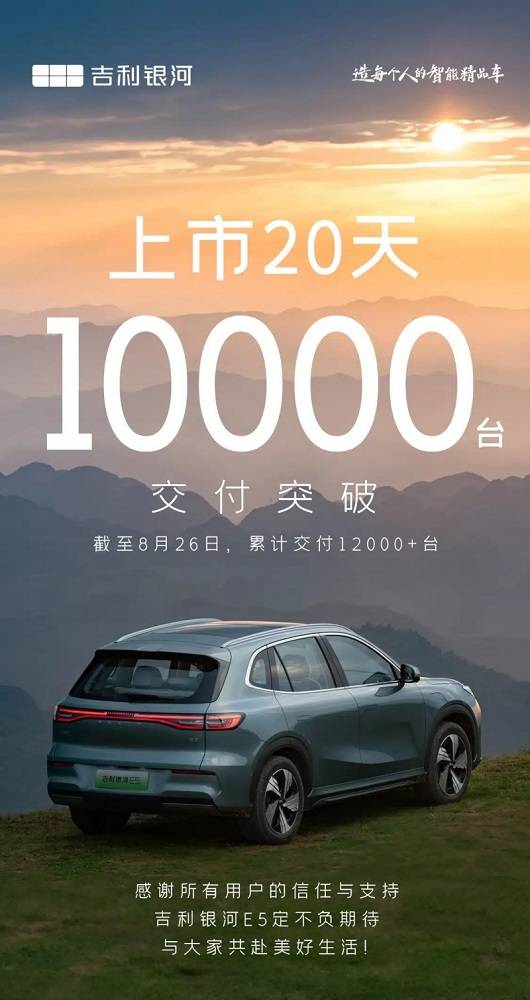 รถยนต์ SUV ไฟฟ้า Galaxy E5 ของ Geely มีอิทธิพลต่อตลาดจีนอย่างรวดเร็ว สามารถส่งมอบได้มากกว่า 10,000 คันภายใน 20 วันแรก หลังจากเปิดตัวเมื่อต้นเดือนสิงหาคมที่ผ่านมา และมียอดขายรวมได้เกิน 12,000 คัน จนถึงปัจจุบัน ซึ่งบ่งชี้ถึงความต้องการที่แข็งแกร่งสำหรับรุ่นใหม่นี้
