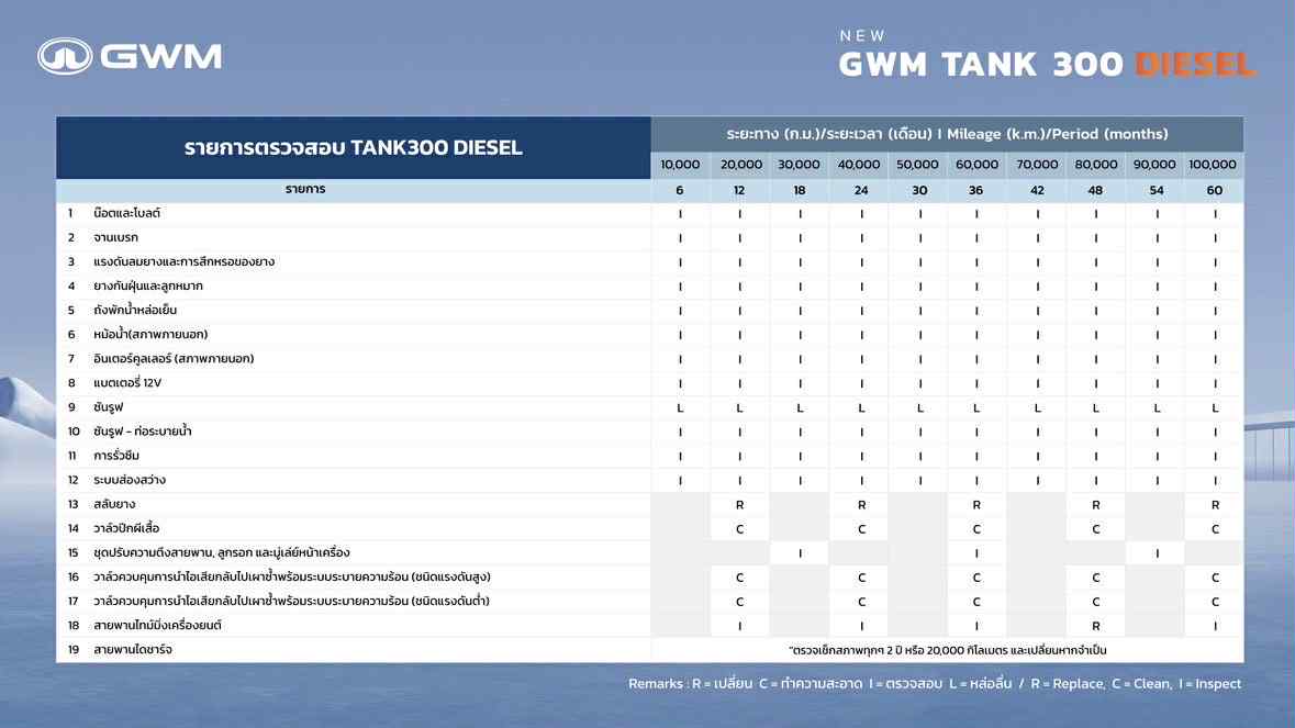 โดยค่าบำรุงรักษาตามระยะทางตลอดระยะเวลา 5 ปี หรือ 100,000 กิโลเมตร จะอยู่ที่เพียง 38,448 บาท หรือเฉลี่ยเพียงปีละประมาณ 7,700 บาท โดยไม่มีค่าแรงเพิ่มเติมในทุกระยะ พร้อมด้วยบริการที่ประทับใจจากทีมช่างเทคนิคที่ผ่านการอบรมตามมาตรฐานของ GWM (ราคาที่กล่าวมายังไม่รวมภาษีมูลค่าเพิ่ม)