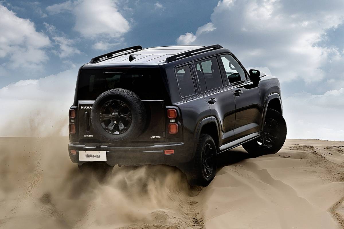 ด้านท้ายชวนให้นึกถึง LAND Rover Defender ด้วยฝาท้ายเปิดเต็มบานพร้อมที่ห้อยยางอะไหล่แทนกล่องใส่ของพร้อมกุญแจล็อกติดตรา HAVAL มีไฟท้าย LED แนวตั้ง รับกันชนหลังดีไซน์เรียบง่าย ล้ออัลลอยสีดำมีทั้งขนาด 17 นิ้ว พร้อมยาง 265/65R17 แบบ A/T all-terrain มาประจำการ (รุ่นปกติมีทั้งขนาด 17 นิ้ว ขนาด 18 นิ้ว พร้อมยาง 265/60 R18 และขนาด 19 นิ้วพร้อมยาง 265/55R19) ตัวรถสร้างจากแชสซีส์ขั้นบันไดหรือ Body on Frame มิติตัวรถตั้งแต่